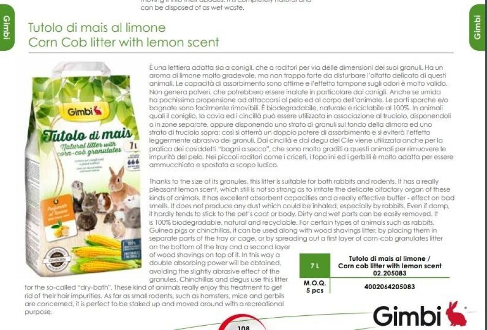 تعتبر فضلات جيمبي المصنوعة من ذرة الذرة مناسبة بشكل خاص للأرانب القزمة والقوارض الصغيرة والطيور والزواحف والحيوانات الأليفة الأخرى، لأنها طبيعية، وحتى إذا تم تناولها عن غير قصد، فهي غير ضارة على الإطلاق.